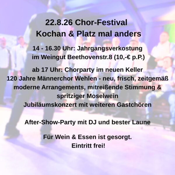 Chorparty im Weingut Kochan & Platz Veröffentlicht am 19. November 2025 um 21:16. Datum: Sa. 22 Aug. 2026Ort: Weingut Kochan & Platz