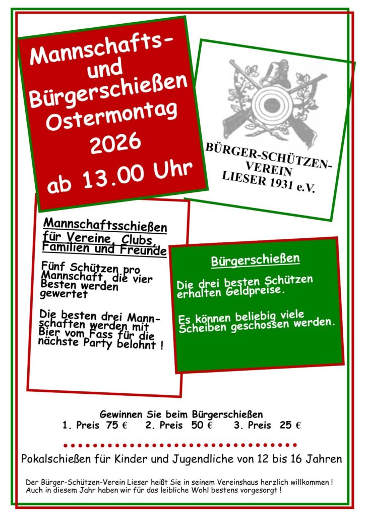 Osterschießen beim Bürger-Schützenverein Lieser Veröffentlicht am 26. März 2026 um 9:08. Datum: Mo. 06 Apr. 2026Ort: Schützenhaus LieserMannschafts- und Bürgerschießen am 0+6.04.2026 ab 13.00 Uhr auf dem Schießstand Lieser. Pokalschießen für Jugendliche zwischen 12 und 16 Jahren. Für das leibliche Wohl ist bestens gesorgt.